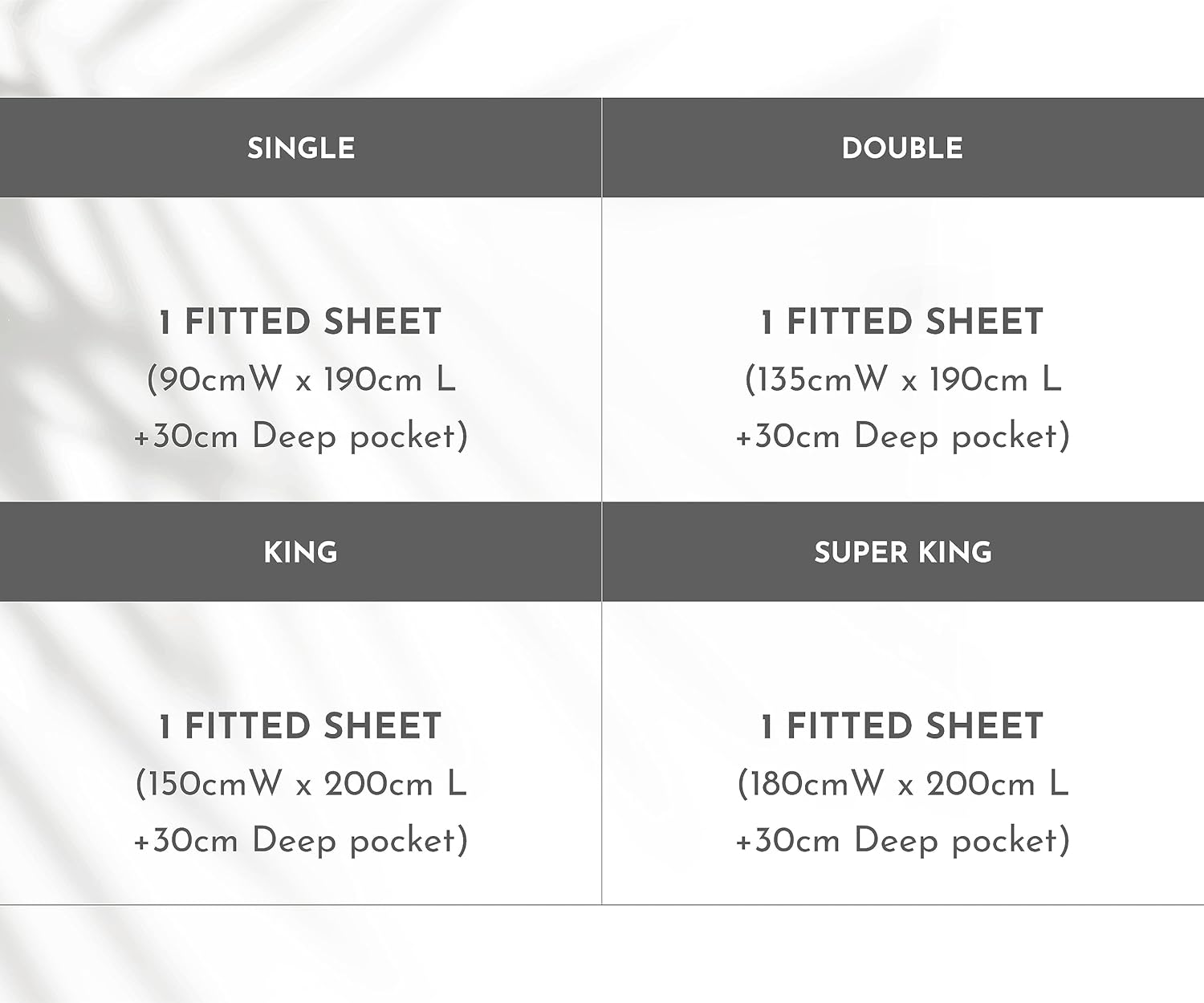 - Perfectly Crafted Fitted Sheet Our king size fitted sheets stay snug on any mattress, with premium elastic and deep pockets ensuring they don't slip, slide, or bunch up. Includes 1 king fitted sheet only measuring 150 cm x 200 cm with 30 cm deep pockets.