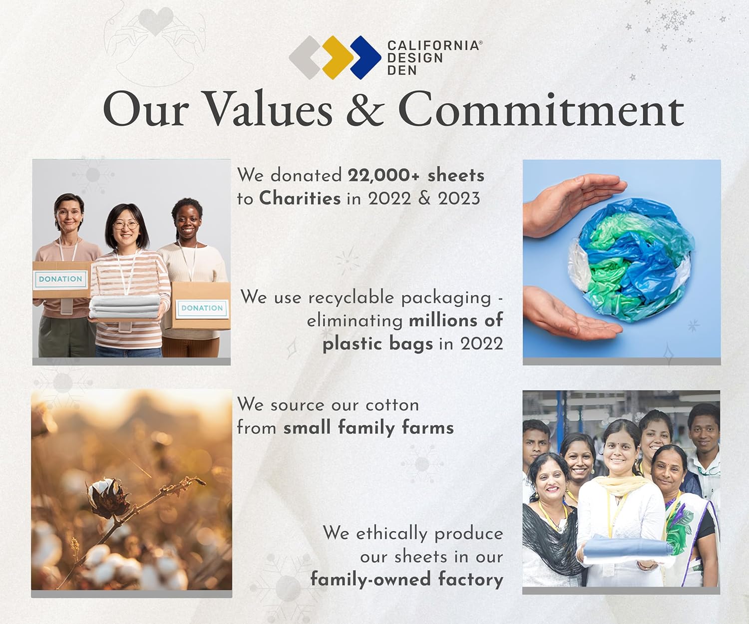 - Our Commitment We strive to do our part. In 2022 & 2023, we donated over 22,000 pieces of bedding to charities. We do not use plastic in our packaging, and our sheets are produced in our family-owned and operated factory in India. Each piece is inspected for quality, and we promise to replace any defective products at no cost to you. Buy with confidence with our 30-day return policy, even if you've washed or used our product.