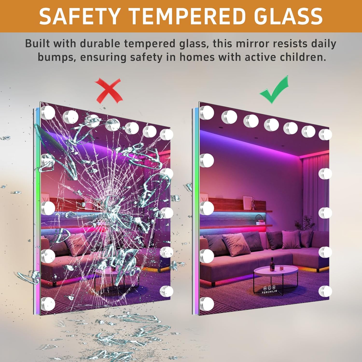 - Rainbow Effect IC RGB Backlit The Hollywood mirror with RGB backlit features smart IC chip, allowing 6 colors can be displayed singly or on one line at the same time- Present Rainbow Visual Effect! Dynamic light modes provide an immersive ambient experience.