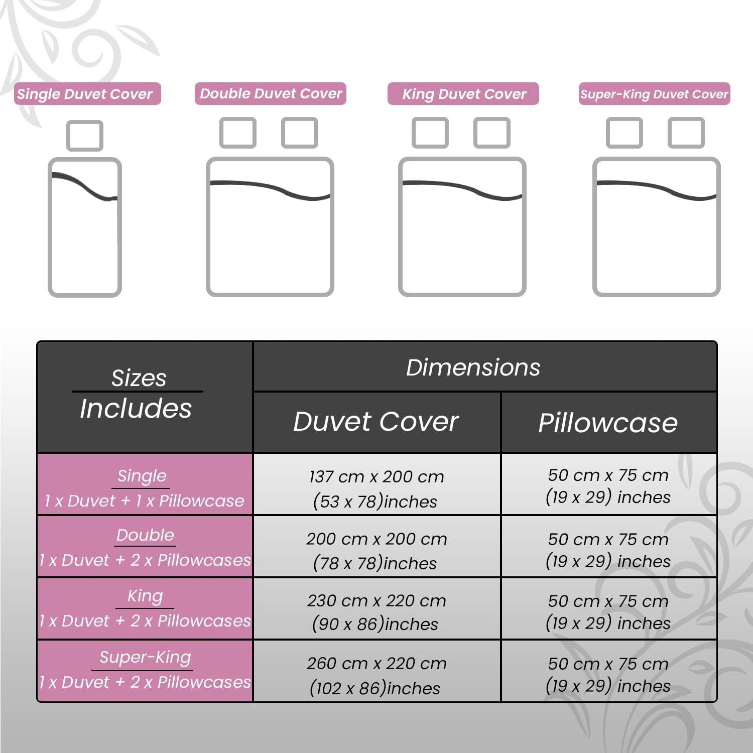 - Included components: Pillowcase, Duvet Cover