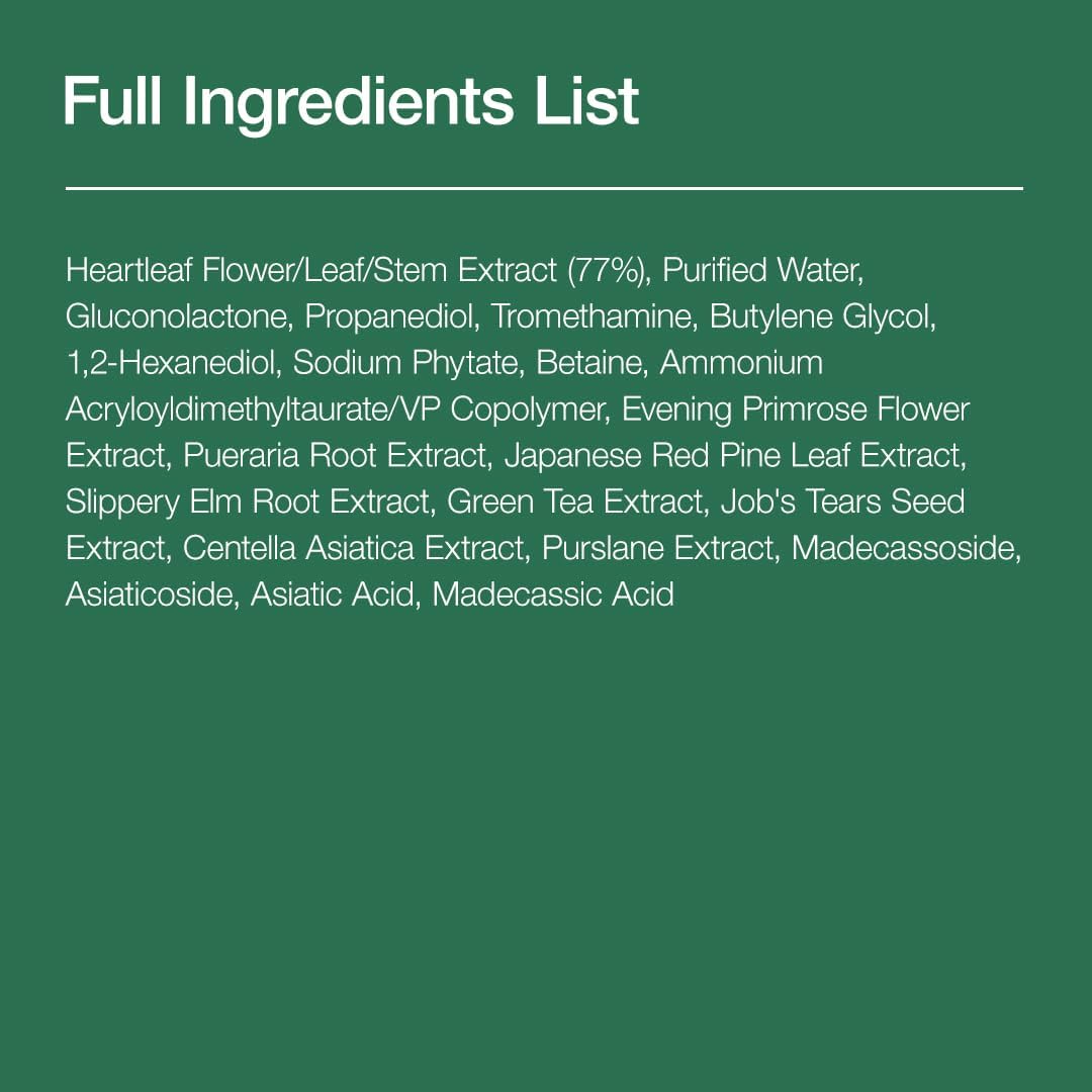 - FORMULATED WITH NATURAL INGREDIENTS Contains 77% Heartleaf Extract, Hypoallergenic and ideal for sensitive skin, this extract calms irritation while providing anti-inflammatory benefits in a watery, non-sticky texture.