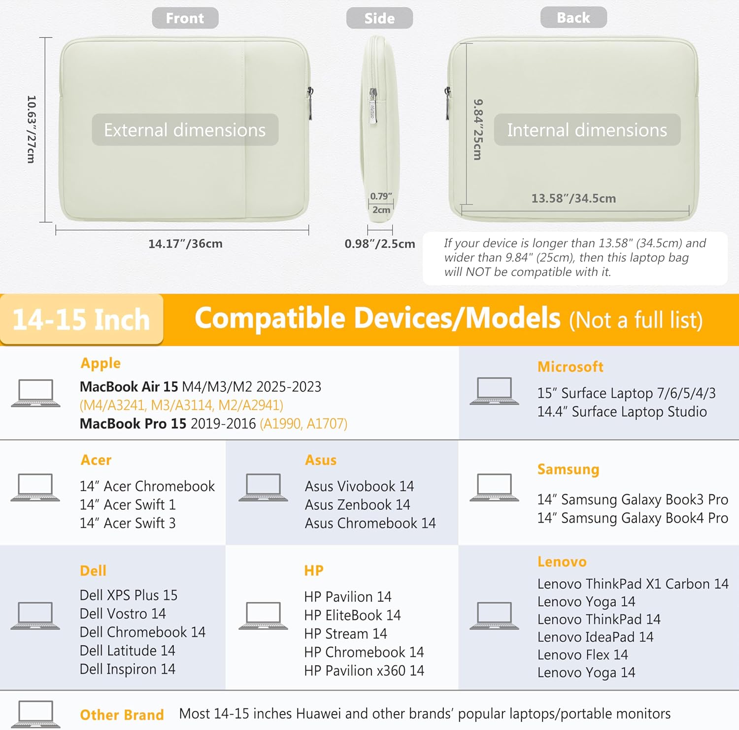 - Internal Dimensions 13.58" x 9.84" x 0.79". Compatible with MacBook Air 15 M4/M3/M2 2025-2023(A3241, A3114, A2941), MacBook Pro 15 2019-2016(A1990, A1707), 14.4" Surface Laptop Studio, 15" Surface Laptop, HP Pavilion/EliteBook/Stream/Chromebook/Pavilion X360 14, Dell XPS 14/15 Plus, Dell Vostro/Chromebook/Latitude/Inspiron 14, Asus Vivobook/Zenbook/Chromebook 14, 14" Acer Chromebook/Swift 1/3, ThinkPad/IdeaPad/Flex/Yoga 14, ThinkPad X1 Carbon/Yoga 14, 14" Samsung Galaxy Book3/Book4 Pro, etc.
