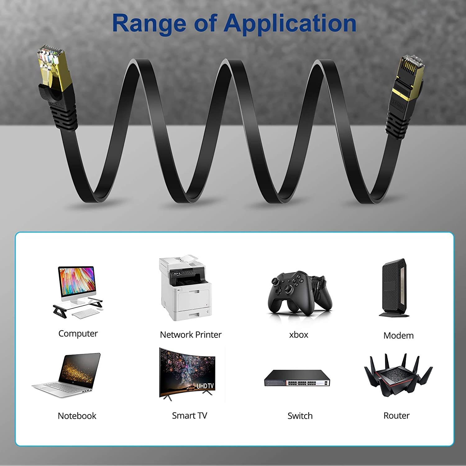 - Great Networking Compatibility This Cat8 Ethernet Cord works perfectly with networking switch, router, modem, PS5, PS4, PS3, Xbox, networking printer, laptop, coupler, hub, smart TV, patch panel and other devices with RJ45 connectors. It's an ideal High Speed Ethernet cable if you want to use the full speed of your internet for home, office, school, hotel, Internet cafe, computer data center, cloud server, enterprise server, etc. Backward compatible with Cat7/Cat6/Cat5/Cat5e Patch Cable.