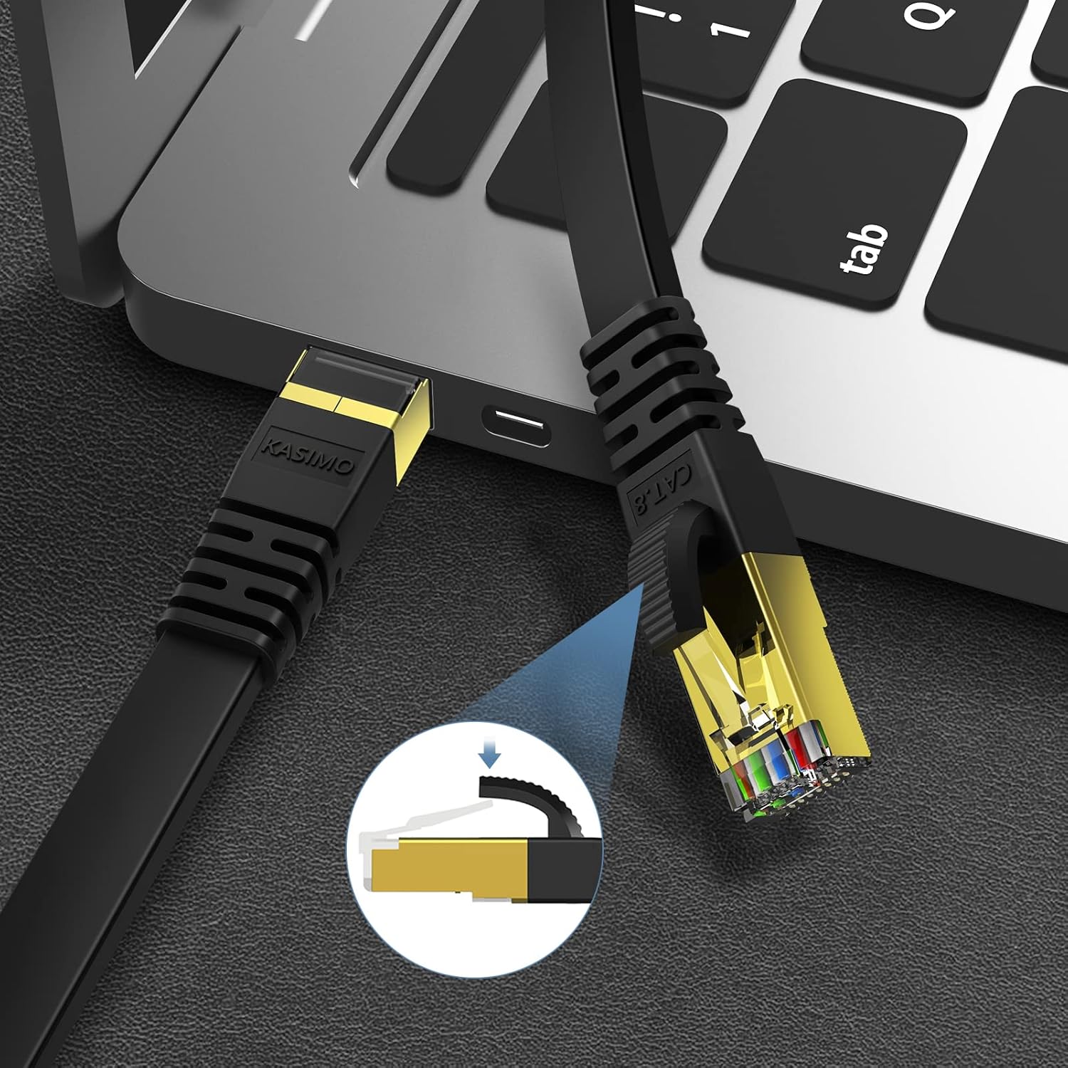 - [Unique Flat Design for Easier Installation] Different from the round rigid and bulky lan cable, KASIMO Flat Cat 8 Ethernet cable is flexible that can be wired up along your house or office. You can route the cables along the edges or corners of the wall easily and seamlessly, or even put them under the carpet as invisible. No worry that your cables are messing or taking too much place. Besides, the black color is resistant to dirt, ideal for outdoor or indoor.