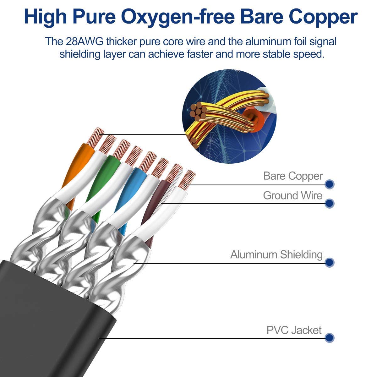 - [Strong Anti-interference Ensure Stable Network] Made of 100% oxygen-free copper inside, 4 pairs of 100% 28AWG pure thick twisted-pair copper wire to achieve high speed transfer. RJ45 connectors on each end with gold plating ensure universal connectivity effectively reduce signal interference and signal attenuation. Aluminum foil provides better protection from crosstalk, noise, degrade signal interference and signal attenuation.