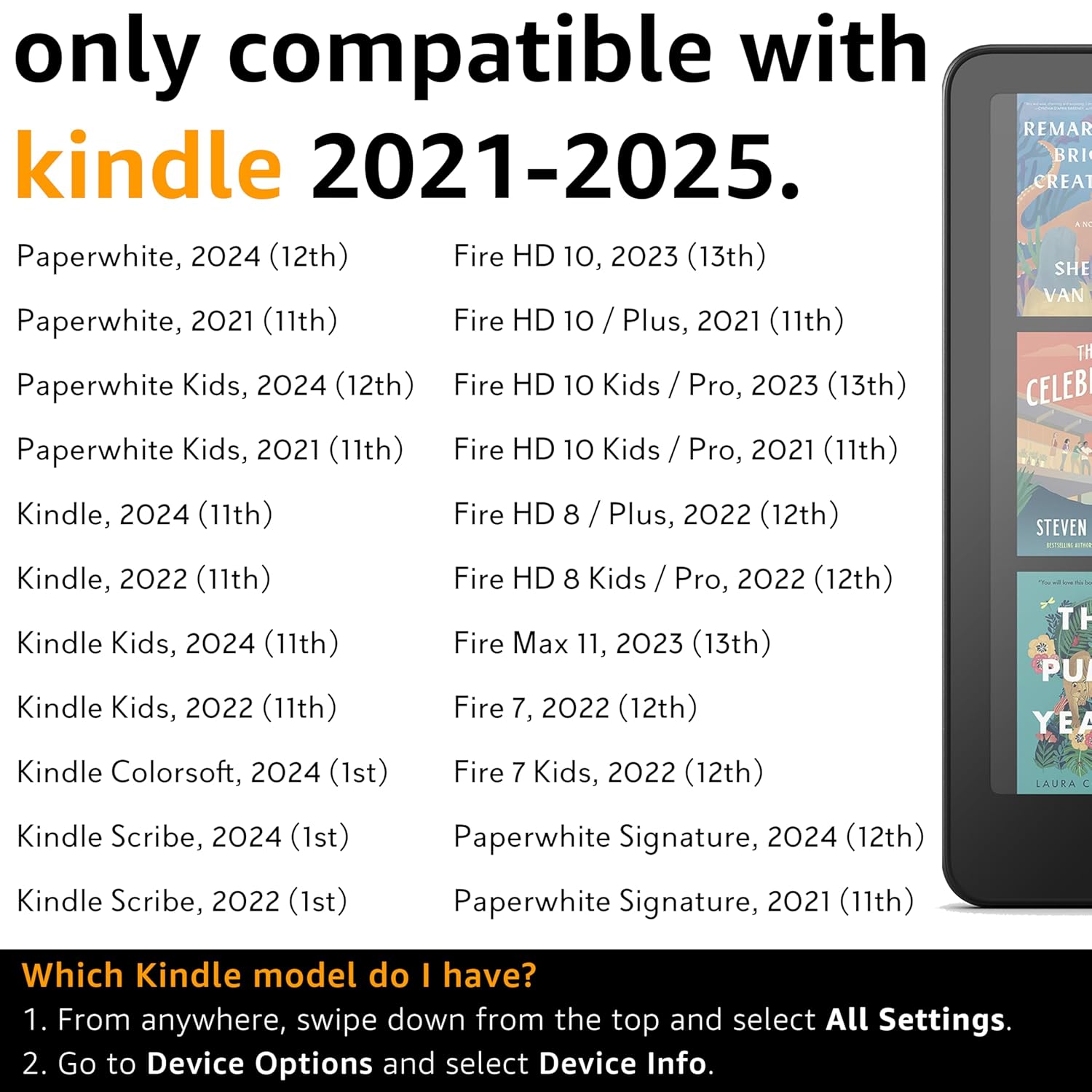 - KINDLE (2021-2024) COMPATIBLE Kindle Colorsoft (Colour) Signature Edition (1st Gen, 2024), Kindle Paperwhite (12th, 2024), Paperwhite Signature (12th, 2024), Kindle (11th, 2024), Kindle Scribe (1st, 2024), Paperwhite Kids (12th, 2024), Kindle Kids (11th, 2024), Kindle Basic Matcha (12th, 2024), Paperwhite (11th, 2021), Paperwhite Kids (11th, 2021), Kindle (11th, 2022), Kindle Kids (11th, 2022), Scribe (1st, 2022), Fire HD 10 (13th, 2023), Fire HD 10 / Plus (11th, 2021), Fire HD 10 Kids / Pro (13th, 2023), Fire HD 10 Kids / Pro (11th 2021), Fire HD 8 / Plus & Fire HD 8 Kids / Pro (12th, 2022), Fire Max 11 (13th, 2023), Fire 7 & Fire 7 Kids (12th, 2022), Paperwhite Signature (11th, 2021).