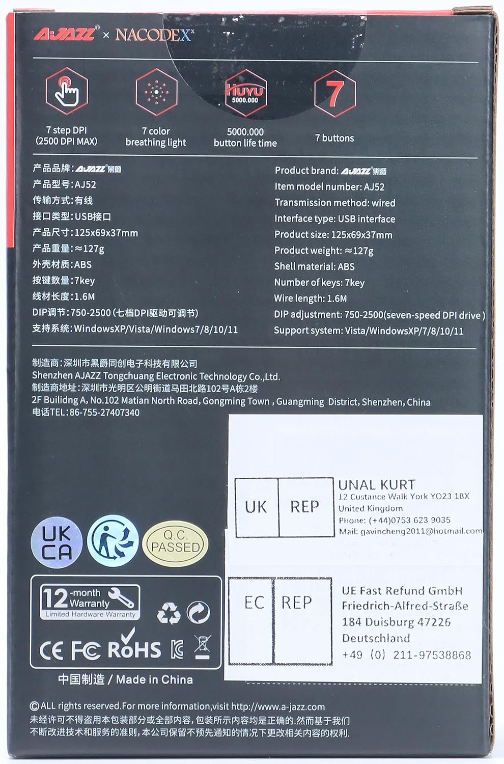- 【PROFESSIONAL GAMING MOUSE】Adjustable 7 level DPI, 750-1000-1250-1500-1750-2000-2500, the weight is 127±5g.Great value, perfect for games, work and daily use.