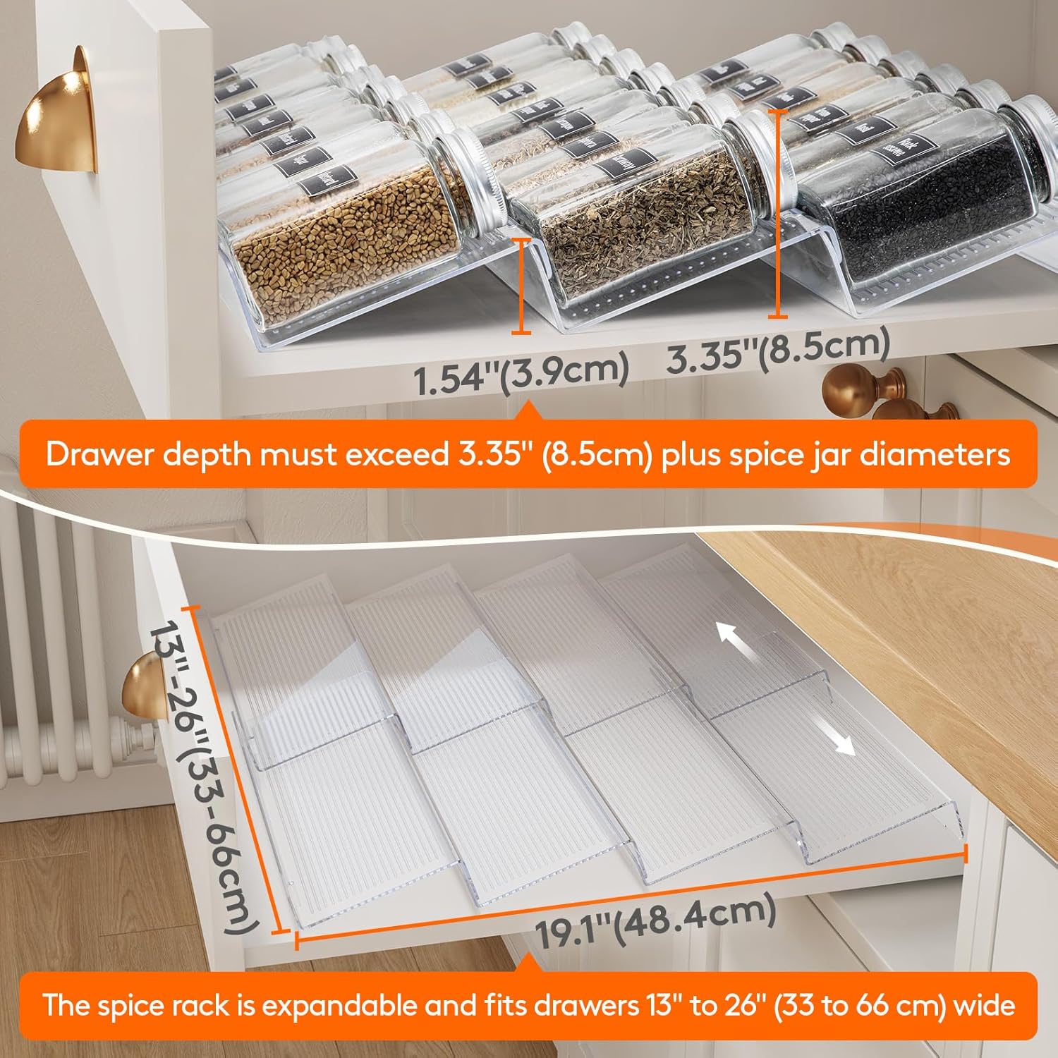 - Adjustable Design The adjustable design of the spice rack makes it expandable with full customization, allowing you to fit it into drawers of different sizes. No need to worry about the spice rack slipping due to the wrong size when opening and closing the drawer. You can also customize how they are combined according to actual usage requirements.