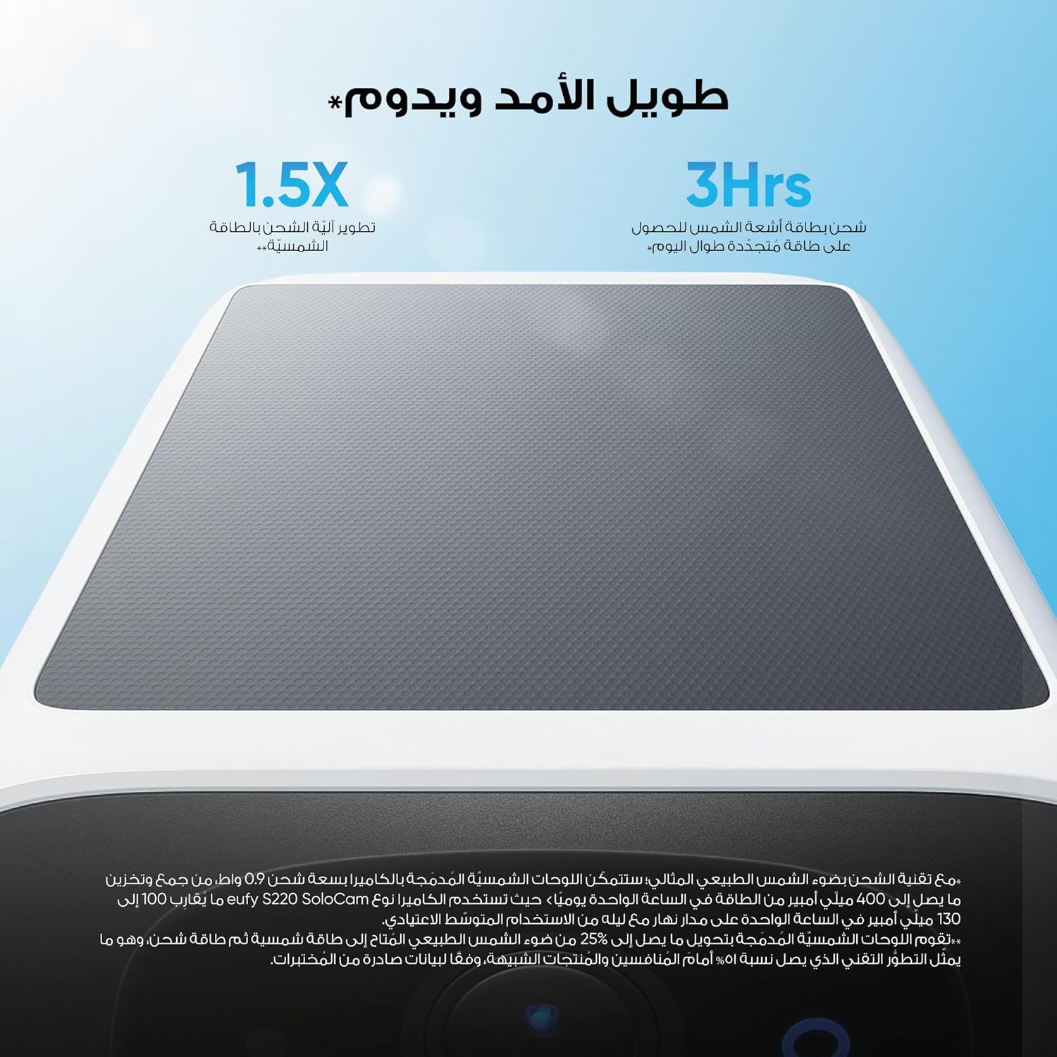 - Powered by solar panel only 3 hours of sunlight per day is enough to power the device.
