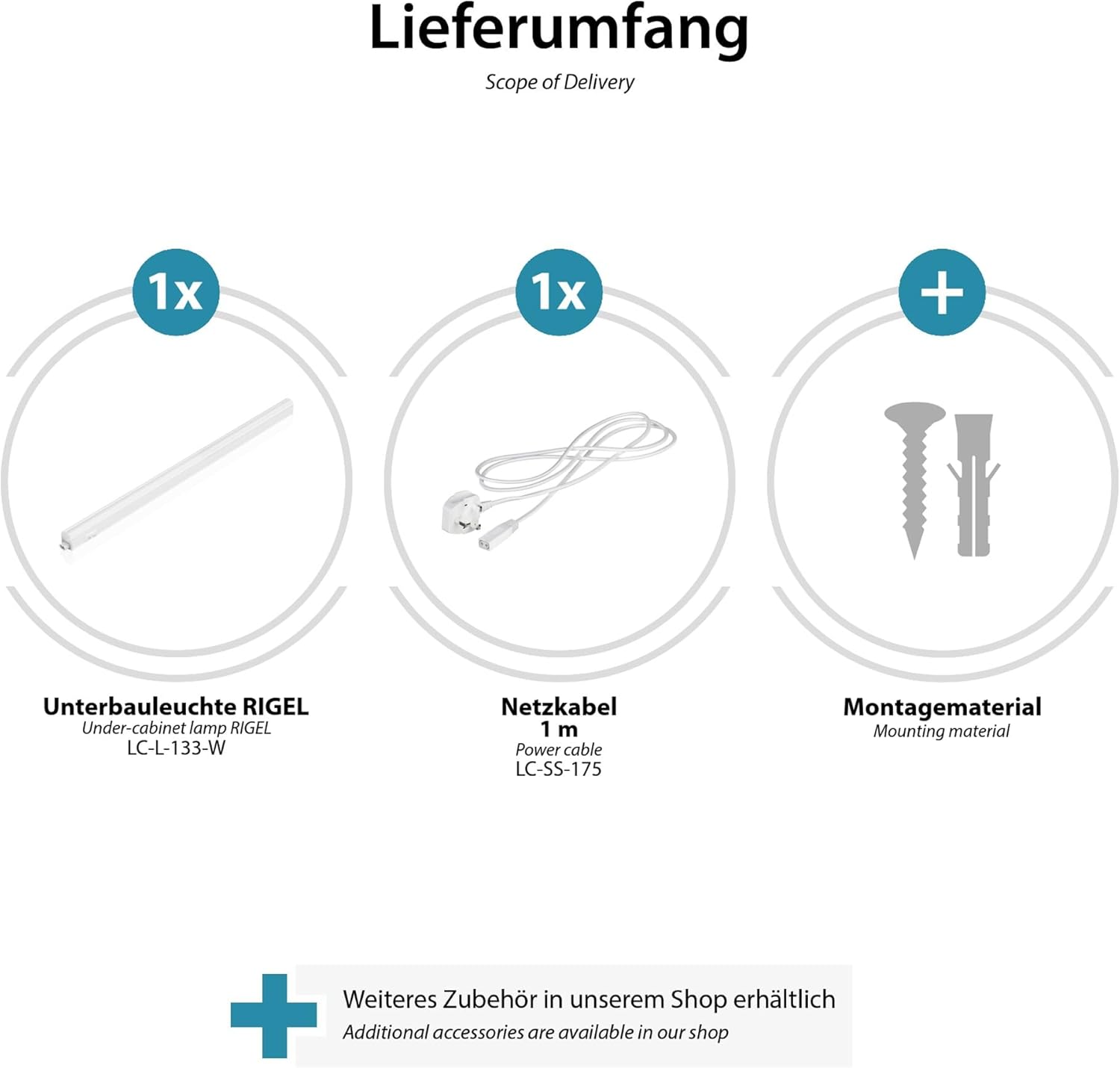- 1 x RIGEL under-cabinet light - LC-L-133-W (2 x fixing clip, 2 x screw, 2 x plugs), 1 x mains cable - LC-SS-175