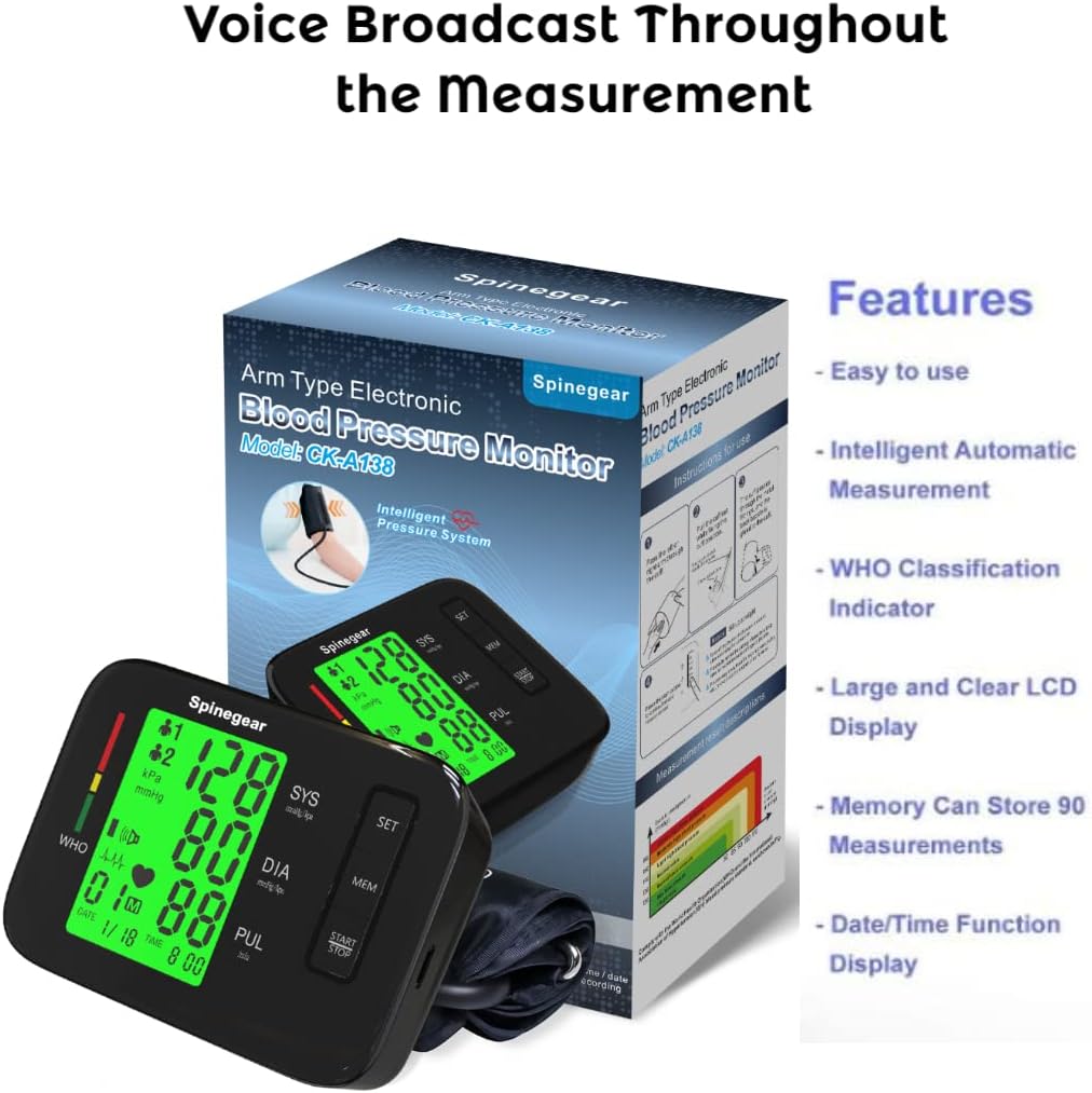 - ✔️Accurate Measurement Spinegear Rechargeable Blood pressure monitor is Certified to the CE Medical Device Directive and suitable for home use and in clinical environments. The design is professional and can be used by the NHS or Medical practitioners. Our blood pressure machine is design with advanced measurement techniques to give you the most accurate reading not only measures blood pressure, but also detects arrhythmia and pulse