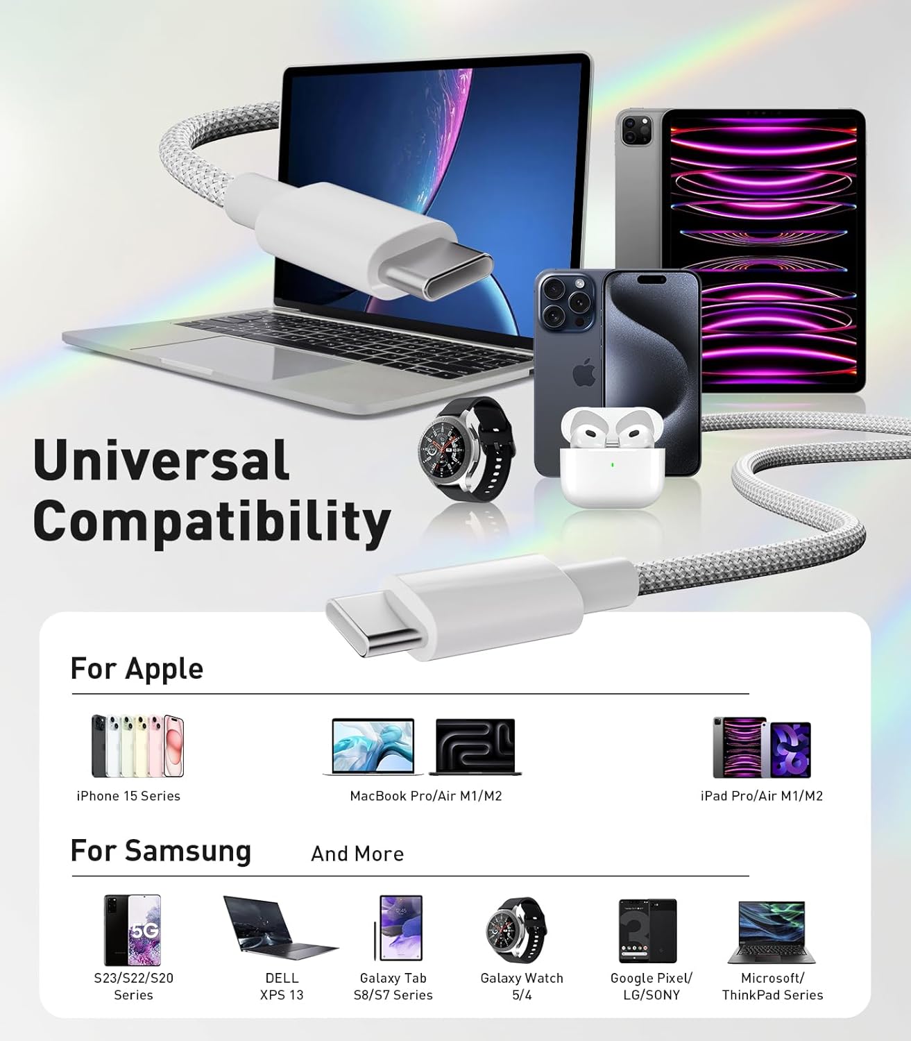 USB-C to USB-C Cable Fast Charge Compatible with iPhone 15, MacBook Pro, iPad Pro/Air, Samsung Galaxy S23/S22/S21 Note 20, Google Pixel, Huawei