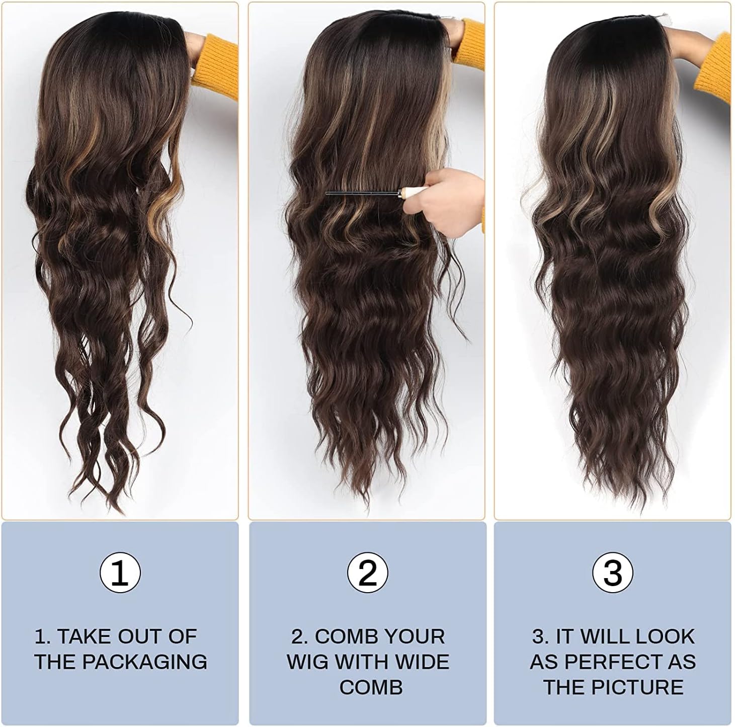- Long Brown Wavy Wig 24 Inch Highlight Wigs for Women Middle Part Curly Synthetic Hair Natural Looking Heat Resistant Fiber for Daily Party Use